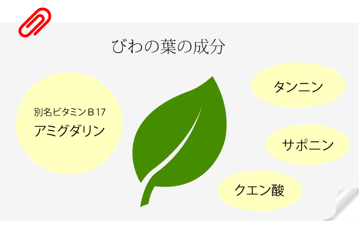 ビワの葉の成分としては、ブドウ糖、ショ糖、果糖、マルトース、澱粉(でんぷん)、デキストリン、酒石酸(しゅせきさん)、クエン酸、リンゴ酸、アミグダリン、タンニン、サポニンなどがあります。